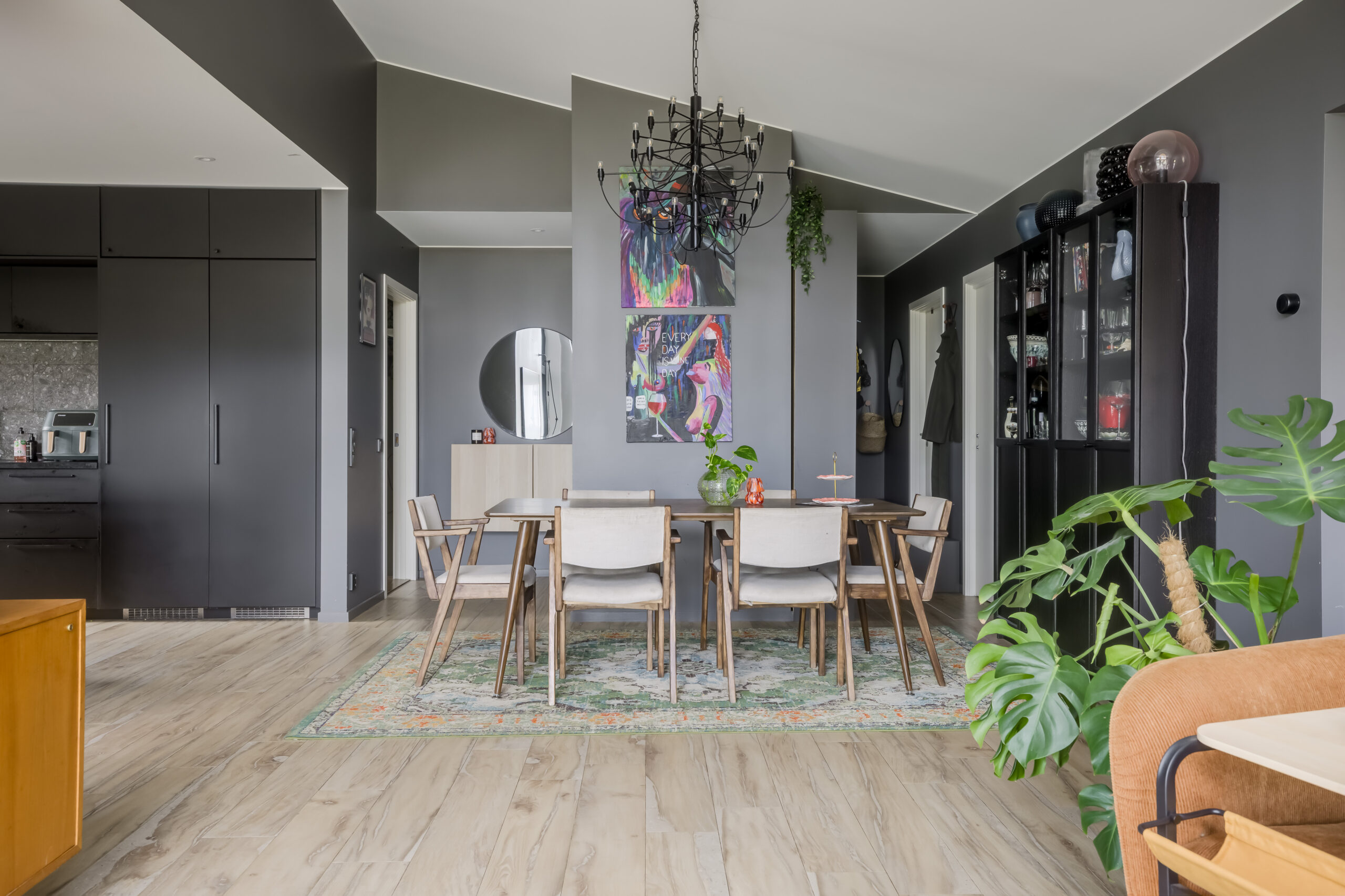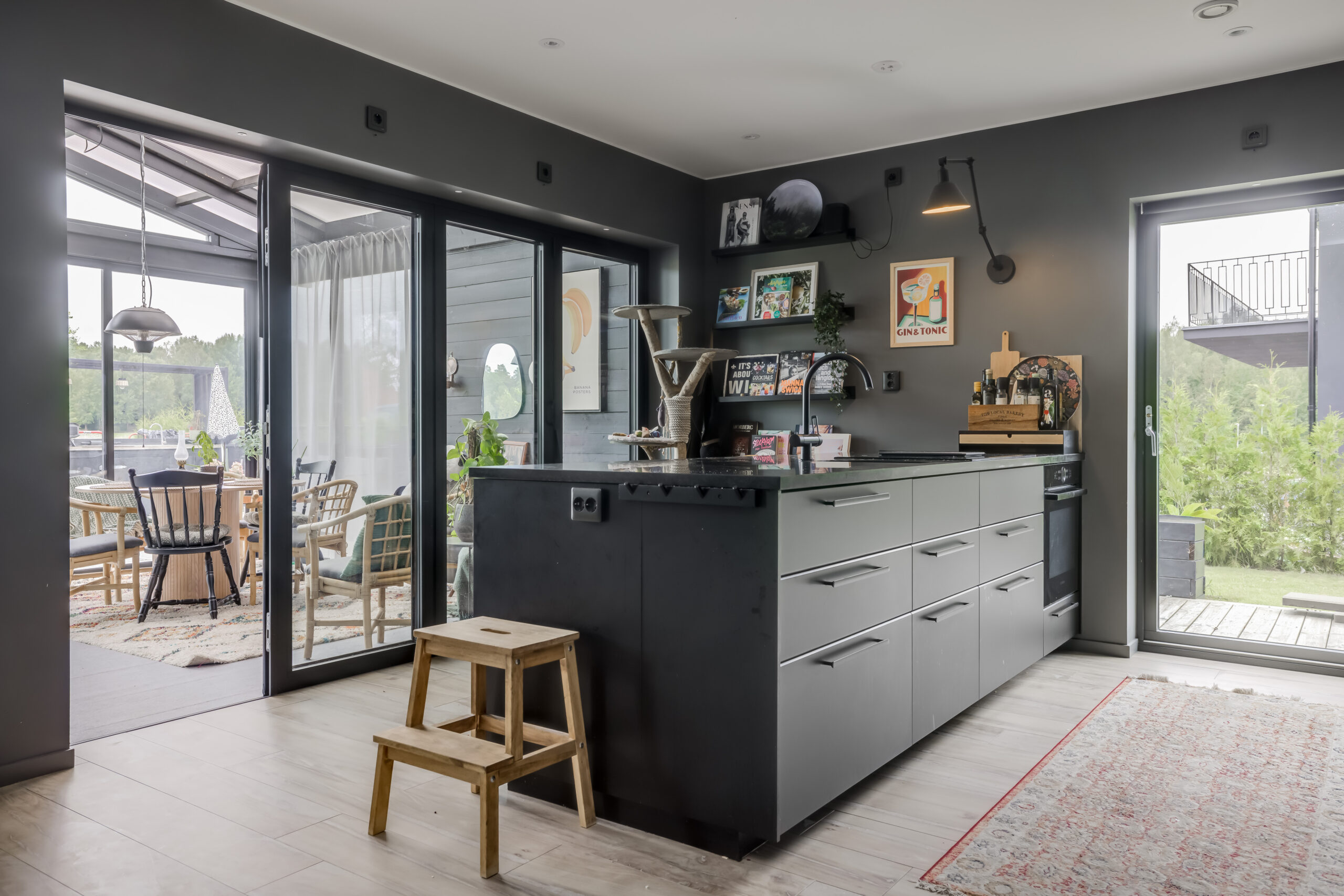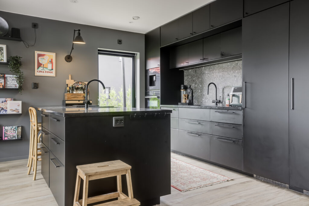 När det gäller stil och känsla gick Malin och Joakim sin egen väg. ”Vi fastnade för svart och mörka färger, medan många andra kanske trivs bättre i ljusa hem. Men vi gillar kontraster och det känns rätt för oss. Inspirationen hämtade vi mycket från sociala medier, men också från våra tidigare hem och andras idéer.”